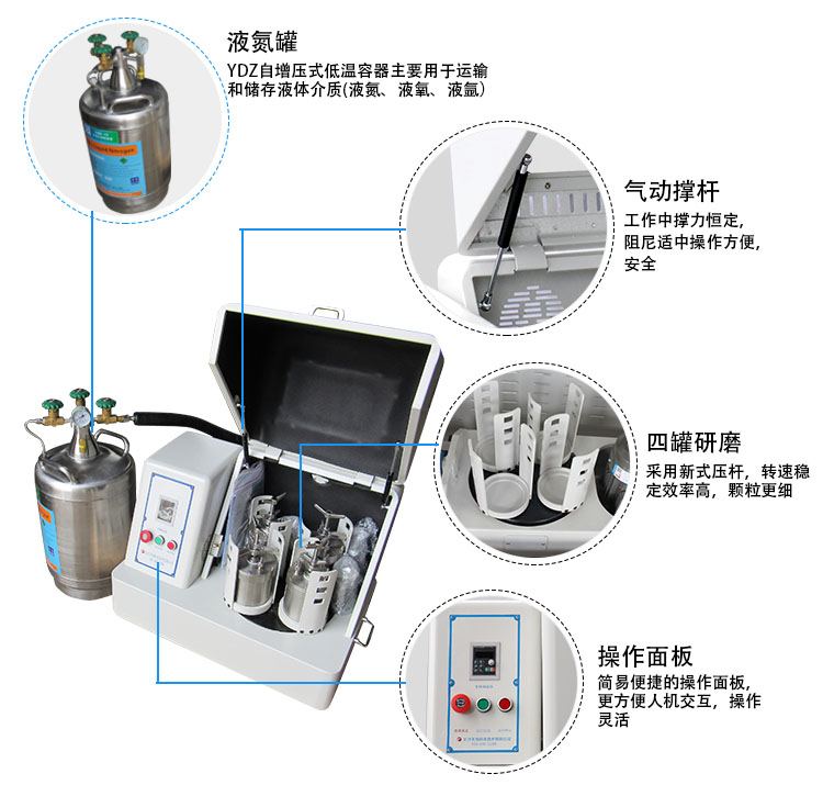液氮行星式球磨機|冷凍行星球磨機設備外殼采用半圓形設計元素,高精密模具沖壓成型,大方精致,高端穩重;機加零件采用數控加工工藝,行星盤整體鑄造成型,傳動齒輪選用特殊材質精密齒輪,確保設備高速運行時平穩安靜;磨罐壓緊裝置操作便捷、安全可靠。由于實現了低溫球磨,擴展了同一種材料研究的適用范圍,使一些原來不能球磨的材料(溫度升高引起質變,形變)可以實現研磨;轉度快、能量大、效率高、粒度細。