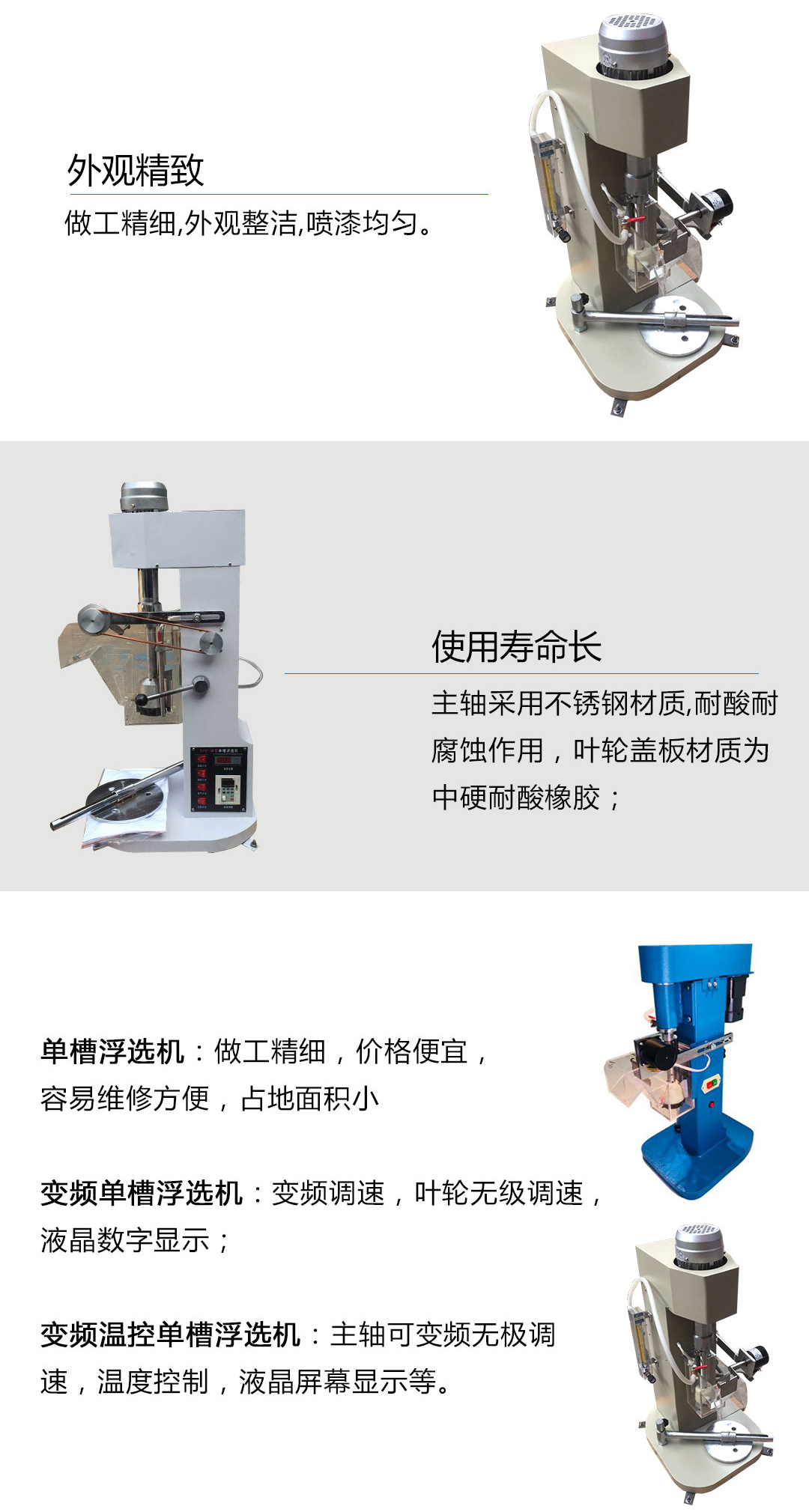 變頻溫控單槽浮選機(jī):主軸可變頻無極調(diào)速,溫度控制,液晶屏幕顯示等。
